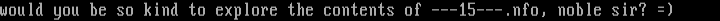 would you be so kind to explore the contents of ---15---.nfo, noble sir?