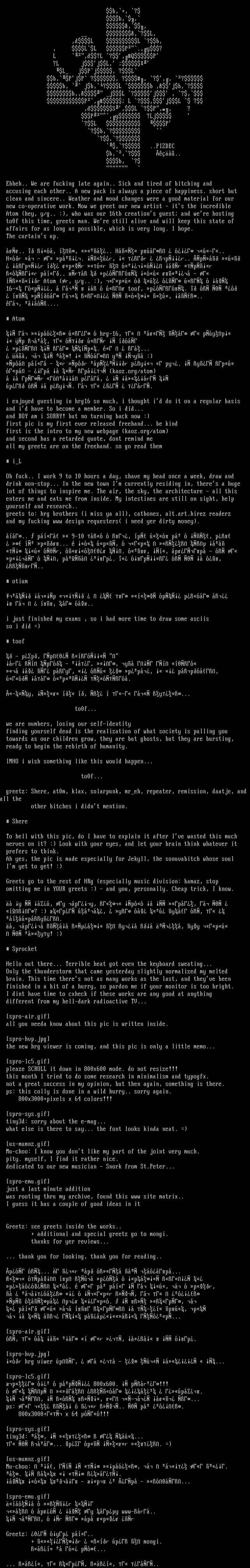 greets to: hrg brothers i miss ya all, catbones, alt.art.hirez readerz