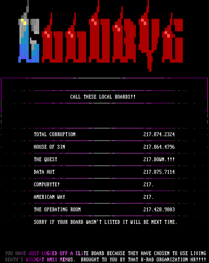 DEATHS WILDCAT ANSI MENUS. BROUGHT TO YOU BY THAT K-RAD ORGANIZATION HR!!!!