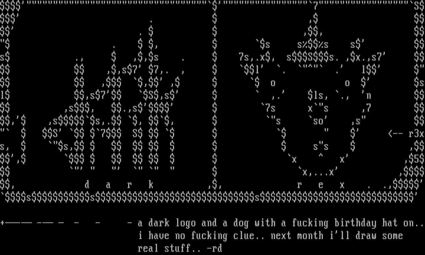 +- - - - - a dark logo and a dog with a fucking birthday hat on.. i have no fucking clue.. next month ill draw some