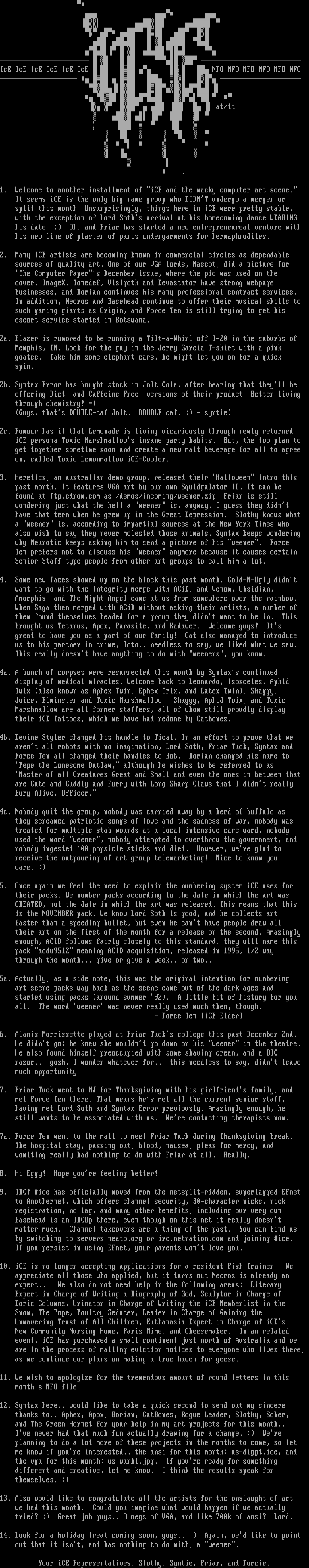 1. Welcome to another installment of iCE and the wacky computer art scene.