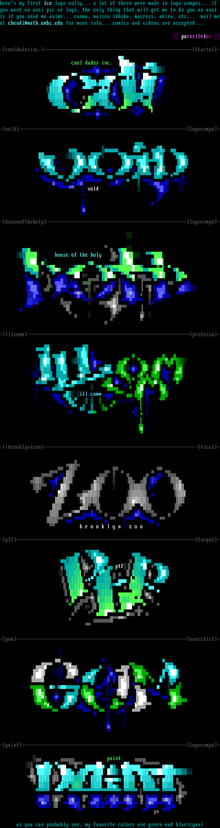heres my first ice logo colly... a lot of these were made in logo compos... if you want an ansi pic or logo, the only thing that will get me to do you an ansi is if you send me anime... ranma, maison ikkoku, macross, akira, etc... mail meat chendi@math.umbc.edu for more info... comics and videos are accepted...