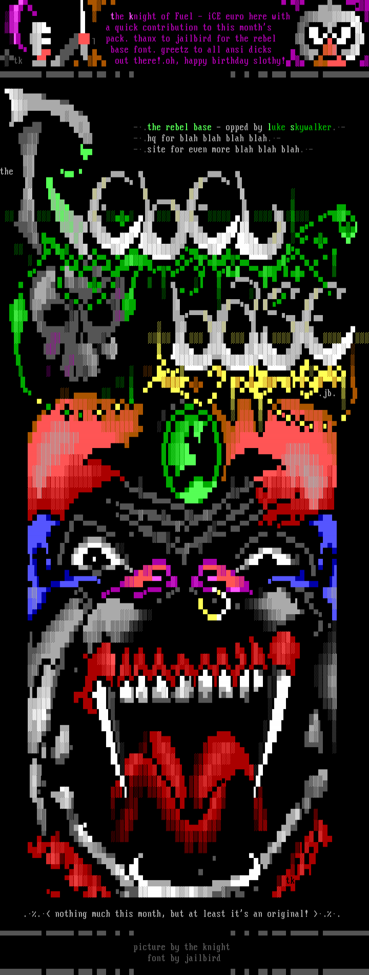 the knight of Fuel - iCE euro here with a quick contribution to this months pack. thanx to jailbird for the rebel base font. greetz to all ansi dicks tk out there!.oh, happy birthday slothy!