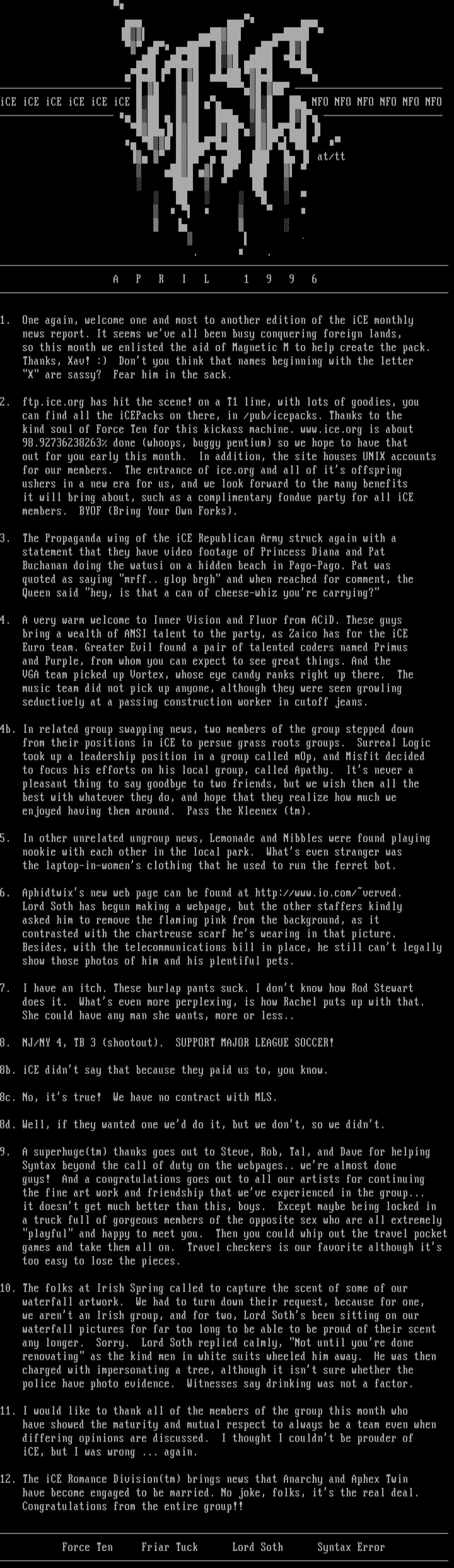 2. ftp.ice.org has hit the scene! on a T1 line, with lots of goodies, you