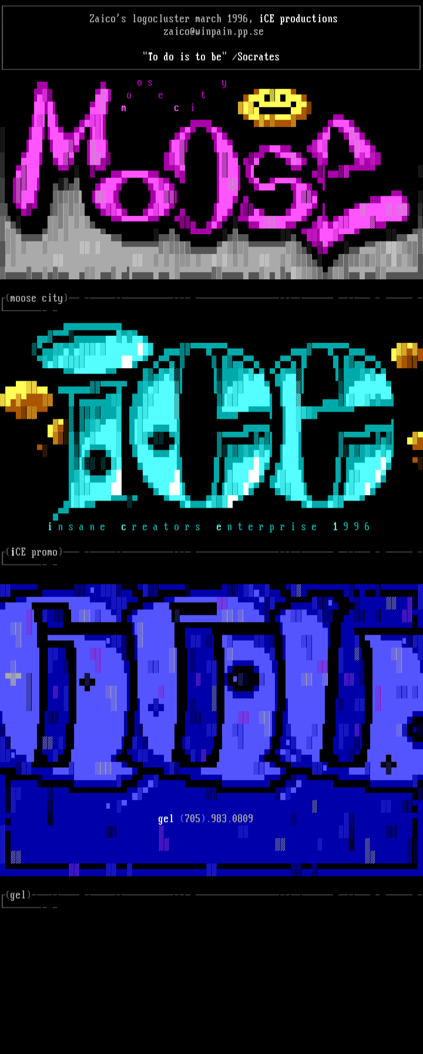 Zaicos logocluster march 1996, iCE productions zaico@winpain.pp.se To do is to be /Socrates o s y