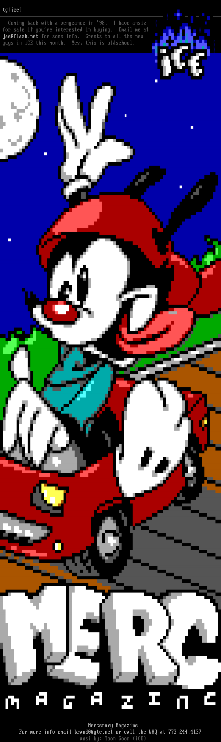 i should have put some stuff in this area. i thought of some houses in black but that would interfere with the black in wakko ohwell.. i loved doing this ansi. im going to hit the web and get more cool animaniacs pics. this is tg toon