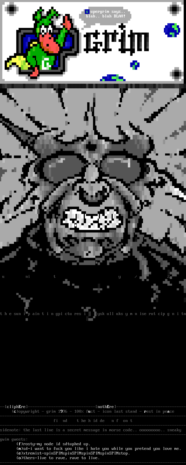 --cliphEre-----------------------------nothEre------------------------------ copywright - grim 1996 - 100 fuct - icon last stand - rest in peace