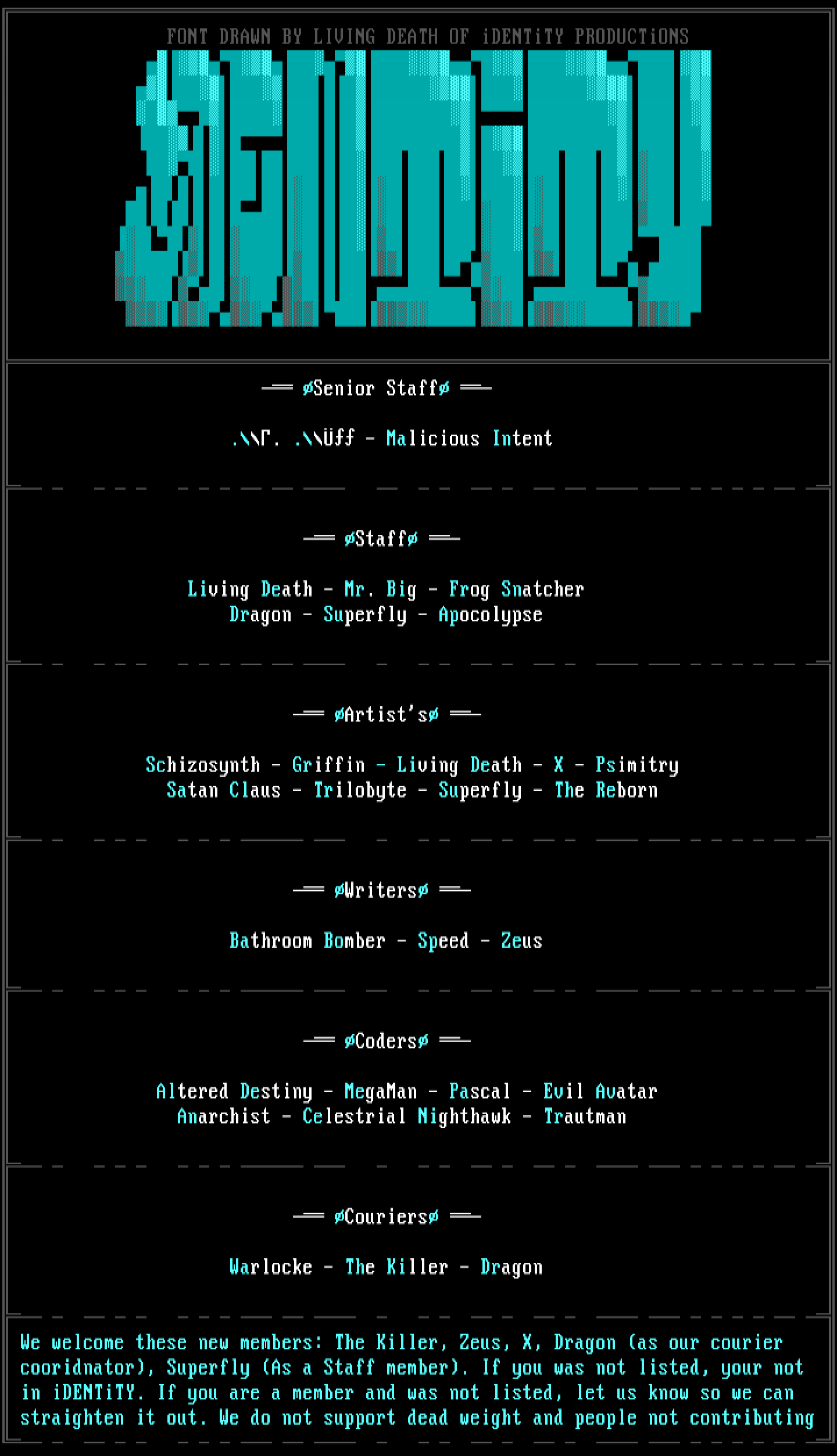 FONT DRAWN BY LIVING DEATH OF iDENTiTY PRODUCTiONS Senior Staff .. . - Malicious Intent Staff Living Death - Mr. Big - Frog Snatcher Dragon - Superfly - Apocolypse Artists Schizosynth - Griffin - Living Death - X - Psimitry Satan Claus - Trilobyte - Superfly - The Reborn Writers Bathroom Bomber - Speed - Zeus Coders Altered Destiny - MegaMan - Pascal - Evil Avatar Anarchist - Celestrial Nighthawk - Trautman Couriers Warlocke - The Killer - Dragon We welcome these new members: The Killer, Zeus, X, Dragon as our courier cooridnator, Superfly As a Staff member. If you was not listed, your not in iDENTiTY. If you are a member and was not listed, let us know so we can straighten it out. We do not support dead weight and people not contributing