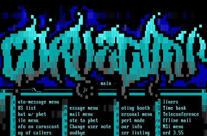 main bf : jx a uto-message menu 1 liners b BS list m essage menu v oting booth Time bank c hat w/ phet e mail menu p ersonal menu ! Teleconference