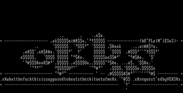 + --------------------- @ ----------- -- ,@@@ --------- +.xXwhatthefuckthisissupposedtobeatstheshitoutofmeXx.@ .xXrequestedbyVEKSXx.+ -------------------------------------------------- ! -------------------- +