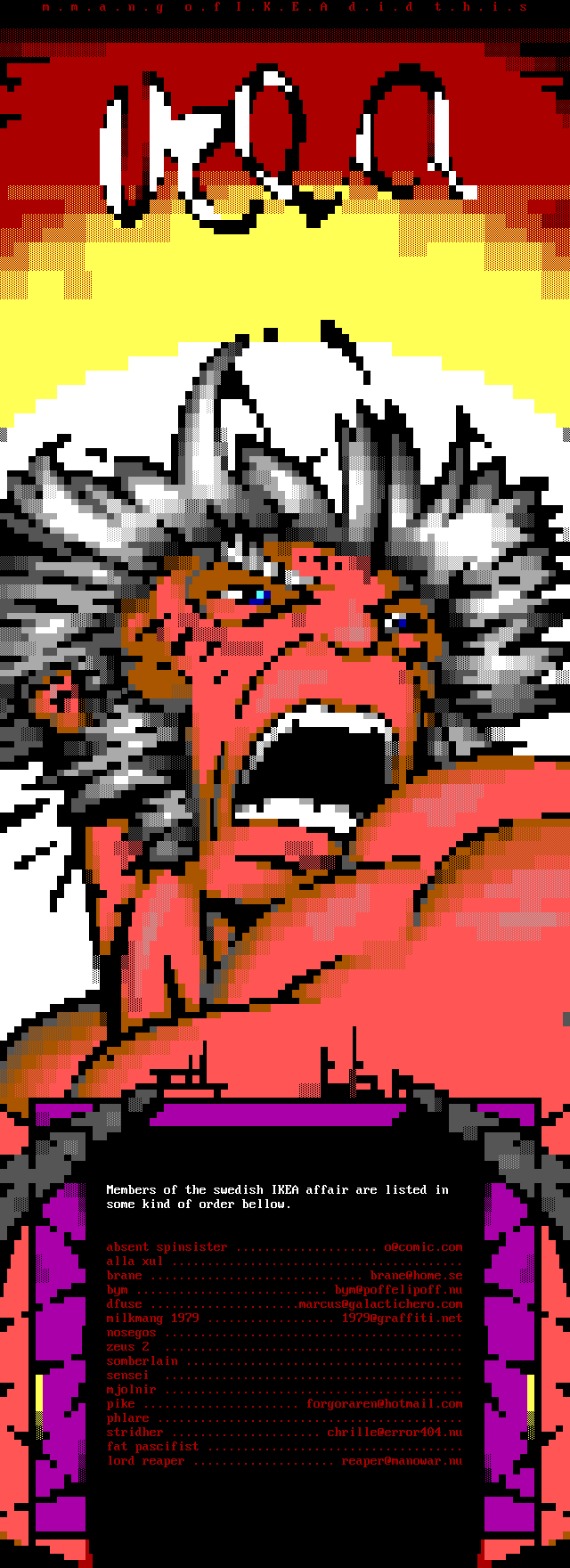 Members of the swedish IKEA affair are listed in some kind of order bellow. absent spinsister .................... o@comic.com alla xul ......................................... brane .............................. brane@home.se bym ........................... bym@poffelipoff.nu dfuse .....................marcus@galactichero.com milkmang 1979 .................. 1979@graffiti.net nosegos .......................................... zeus 2 .......................................... somberlain ....................................... sensei .......................................... mjolnir .......................................... pike ...................... forgoraren@hotmail.com phlare ........................................... stridher ..................... chrille@error404.nu fat pascifist .................................... lord reaper .................... reaper@manowar.nu