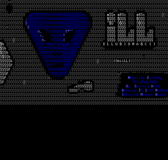 oO , ,oO,qP4q, aa sSs sSs ,, qggp ,d,TaaT,b, , , ,i, ,i, , , ,b, II ,d, b,bQggQd, I L L U S I O N A S C I I b,,Ss.......................sSb8,,b,LdbJ,b,,SAiLLP,,T.,P,,,P,,,qPP,Q,,Q Negative Ecstasy