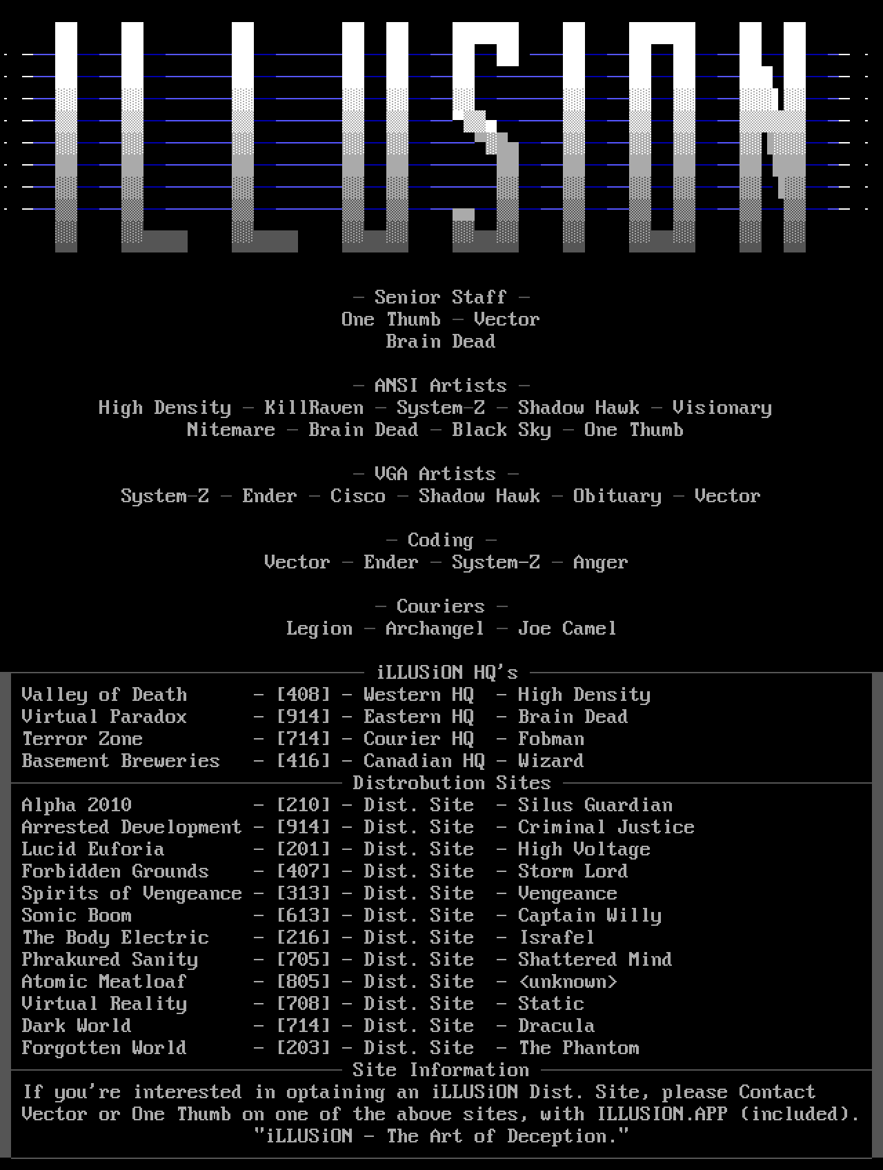 iLLUSiON HQs Valley of Death - 408 - Western HQ - High Density Virtual Paradox - 914 - Eastern HQ - Brain Dead Terror Zone - 714 - Courier HQ - Fobman Basement Breweries - 416 - Canadian HQ - Wizard Distrobution Sites Alpha 2010 - 210 - Dist. Site - Silus Guardian Arrested Development - 914 - Dist. Site - Criminal Justice Lucid Euforia - 201 - Dist. Site - High Voltage Forbidden Grounds - 407 - Dist. Site - Storm Lord Spirits of Vengeance - 313 - Dist. Site - Vengeance Sonic Boom - 613 - Dist. Site - Captain Willy The Body Electric - 216 - Dist. Site - Israfel Phrakured Sanity - 705 - Dist. Site - Shattered Mind Atomic Meatloaf - 805 - Dist. Site - unknown Virtual Reality - 708 - Dist. Site - Static Dark World - 714 - Dist. Site - Dracula Forgotten World - 203 - Dist. Site - The Phantom Site Information If youre interested in optaining an iLLUSiON Dist. Site, please Contact Vector or One Thumb on one of the above sites, with ILLUSION.APP included. iLLUSiON - The Art of Deception.