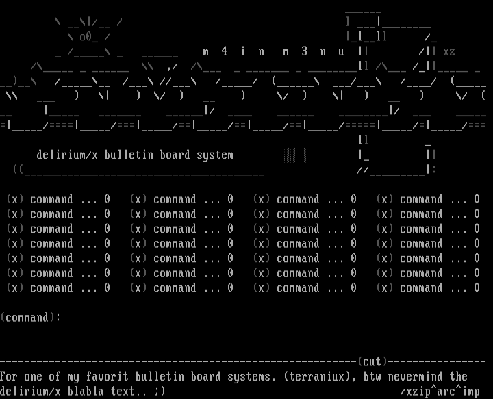 ----------------------------------------------------------cut---------------- For one of my favorit bulletin board systems. terraniux, btw nevermind the