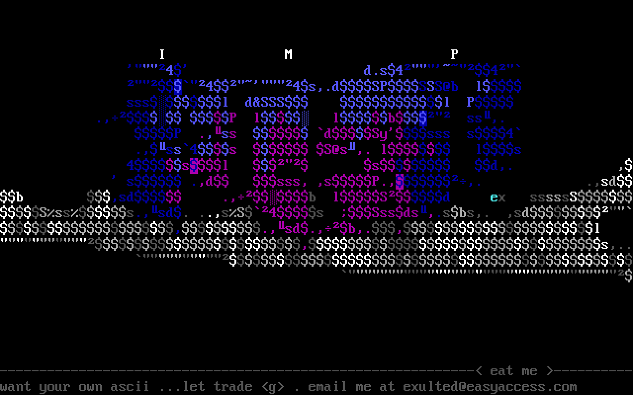 ------------------------------------------------------------ eat me ----------want your own ascii ...let trade g . email me at exulted@easyaccess.com