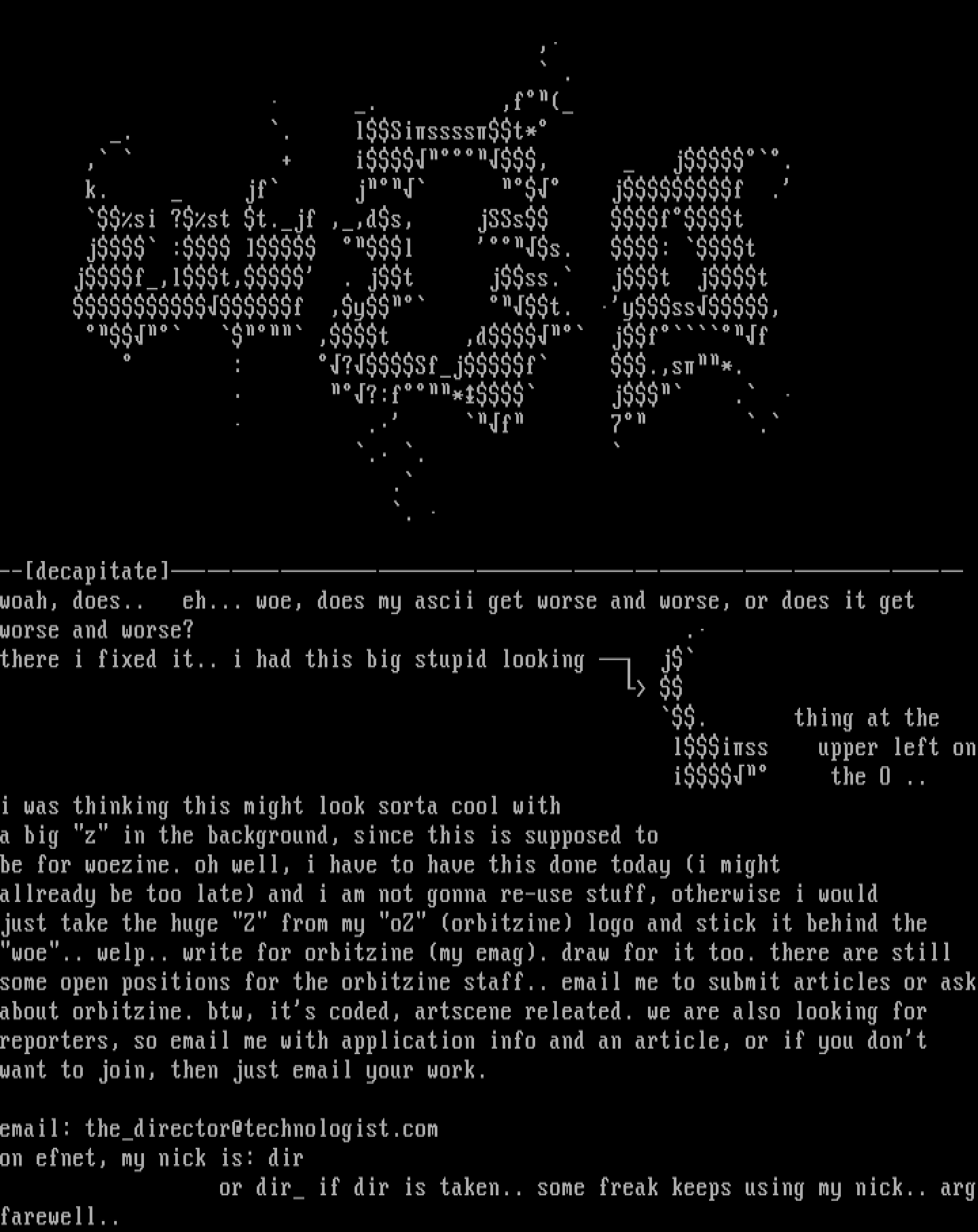 some open positions for the orbitzine staff.. email me to submit articles or askabout orbitzine. btw, its coded, artscene releated. we are also looking for