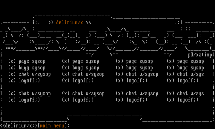 .---------- i:. delirium/x .:l ----------. / : / : ::: /: /: : : // :/: :/: / : : : / : . : :i / /pO/xzimp: x page sysop x page sysop x page sysop x page sysop il x bugg sysop x bugg sysop x bugg sysop x bugg sysop l. x chat w/sysop x chat w/sysop x chat w/sysop x chat w/sys :i x logoff x logoff x logoff x logoff .l il x chat w/sysop x chat w/sysop x chat w/sysop x chat w/sys l: x logoff x logoff x logoff x logoff i. .i ii /:delirium/xmainmenu: