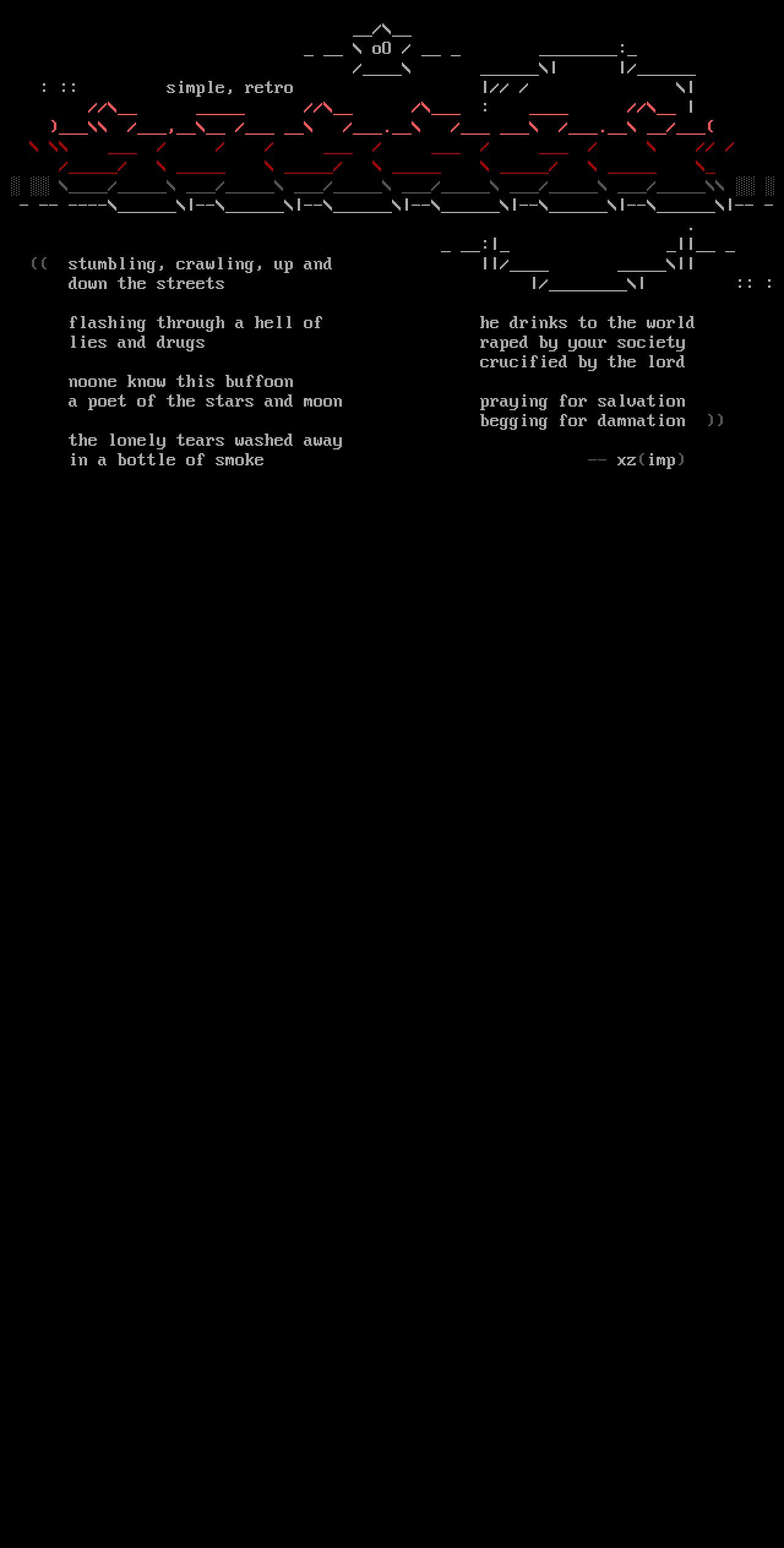 / oO / : / / : :: simple, retro // / // // / : // /, / /. / /. / / / / / / / // / // / / / / / / / / - -- ---------------- - . : stumbling, crawling, up and / down the streets / :: : flashing through a hell of he drinks to the world lies and drugs raped by your society crucified by the lord noone know this buffoon a poet of the stars and moon praying for salvation begging for damnation the lonely tears washed away in a bottle of smoke -- xzimp