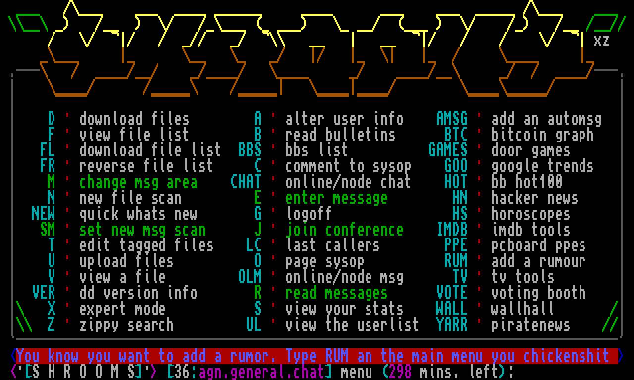 S H R O O M S 36:agn.general.chat menu 298 mins. left: