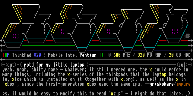 +------------------------------------------------------------------------------+-cut- motd for my little laptop ------------------------------------cut- yeah, yeah, shitty name - whatever it still needed one. the x could refer to