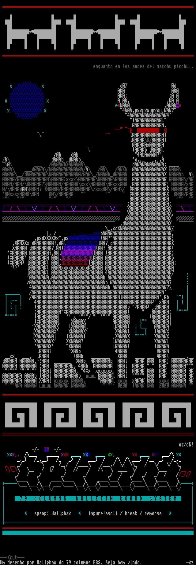 Um desenho por Haliphax do 79 columns BBS. Seja bem vindo. -xz