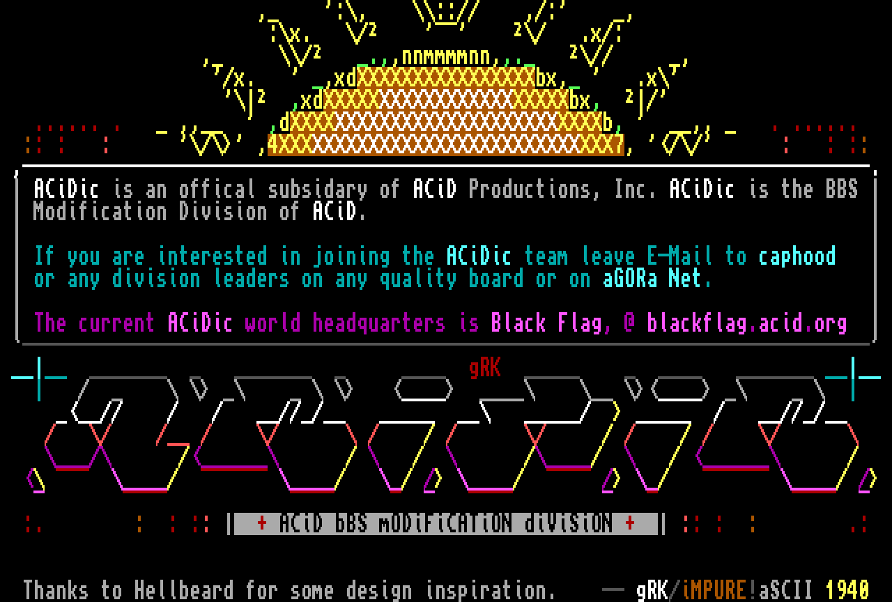 ACiDic is an offical subsidary of ACiD Productions, Inc. ACiDic is the BBS