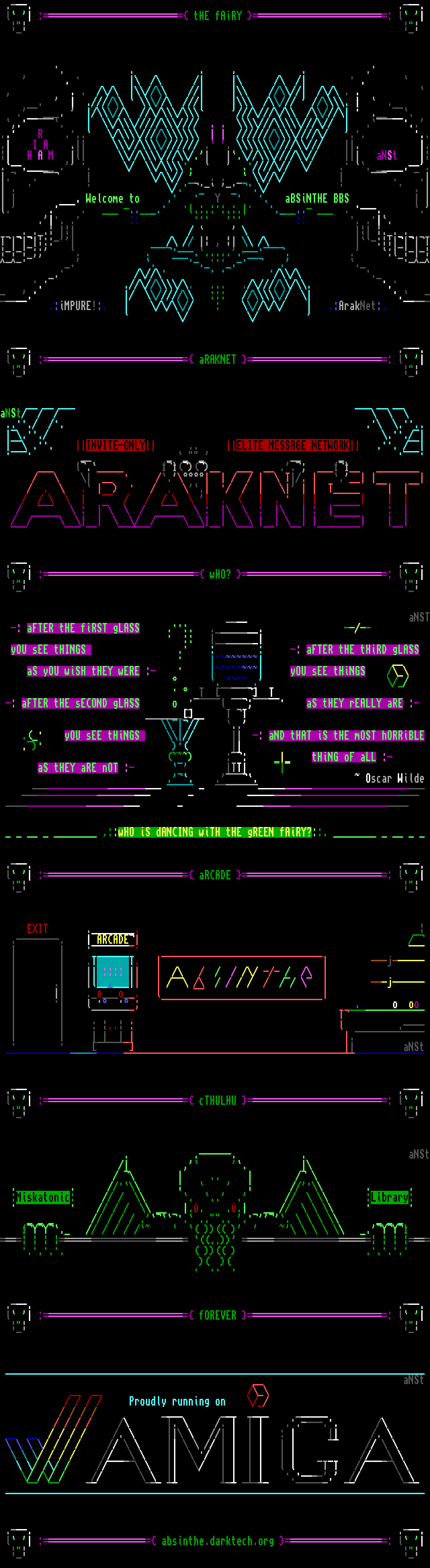 .. R ... .. ... I A . . . . . H A M l . . aNSt .--. . . / /. . / . . .--.. . . . . . . /.- -./ . . Welcome to . Y . aBSiNTHE BBS l. . . -... l.:.::.:. ...- . ---. . .. . :: :: . ..