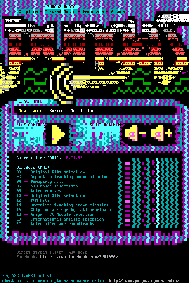 Now playing: Xerxes - Meditation PLAY CONTROL SOUND VOLUMEN Current time ART: 18:21:59 Schedule ART 00 -- Original SIDs selection 02 -- Argentine tracking scene classics 04 -- Demoparty hits 06 -- SID cover selectionn 08 -- Retro remixes 10 -- Original SIDs selection 12 -- PVM hits 14 -- Argentine tracking scene classics 16 -- Chiptune and vgm by latinamericans 18 -- Amiga / PC Module selection 20 -- International artists selection 22 -- Retro videogame soundtracks