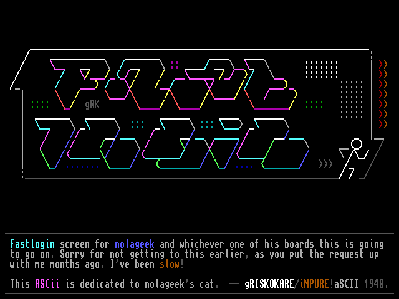 This ASCii is dedicated to nolageeks cat. -- gRISKOKARE/iMPURE!aSCII 1940.