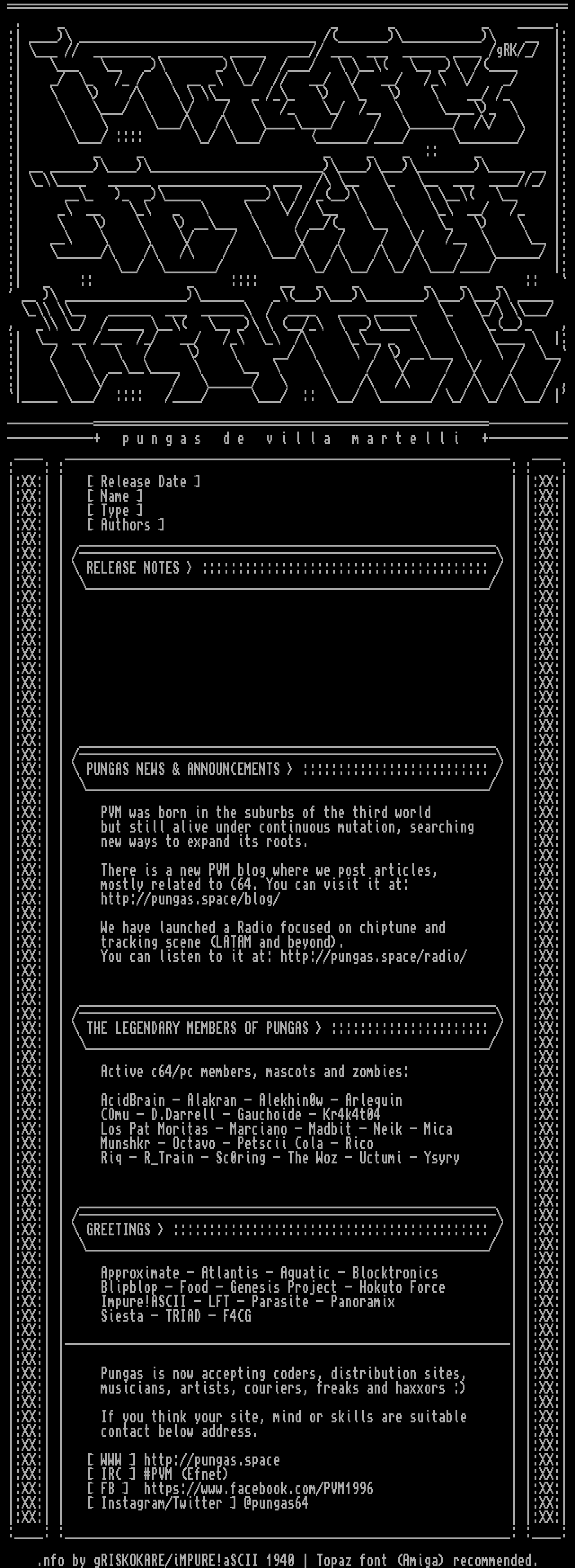 .nfo by gRISKOKARE/iMPURE!aSCII 1940 Topaz font Amiga recommended.
