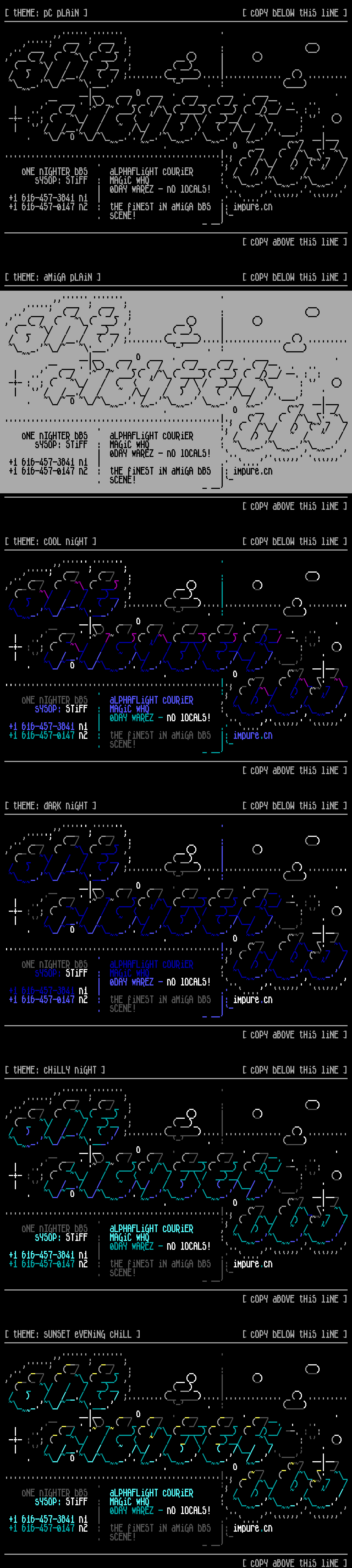 ...... ....... . ...... .. / / : : , / , / / / / / /./ / ........ ................. ......... ./ . - . : o . . . .-- . / / / / /--. . .. .. / / ,/ // --. : : -+- : / / / / / / : / /./ / // / // /. . / o / .. / . . . / . --- . o / / .................................................., / / . :, // / ,/ / oNE nIGHTER bBS aLPHAFLiGHT cOURiER , / / / / / sYSOP: STiFF : MAGiC wHQ : . . . 0DAY wAREZ - nO lOCALS! .. ,. .. . +1 616-457-3841 n1 . .... +1 616-457-0147 n2 : tHE fiNEST iN aMiGA bBS : impure.cn . sCENE! - - -- ------------------------------------------------------------------------------