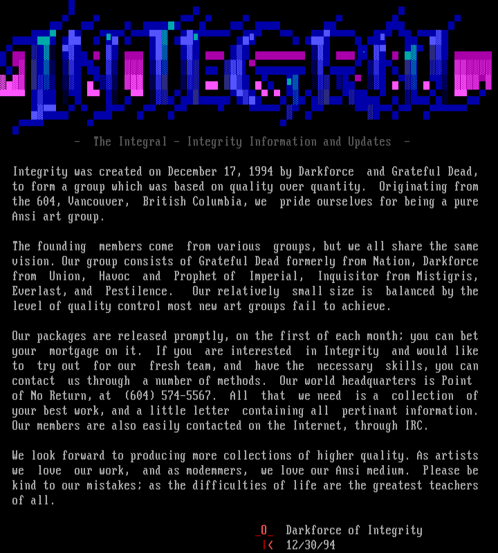 Integrity was created on December 17, 1994 by Darkforce and G