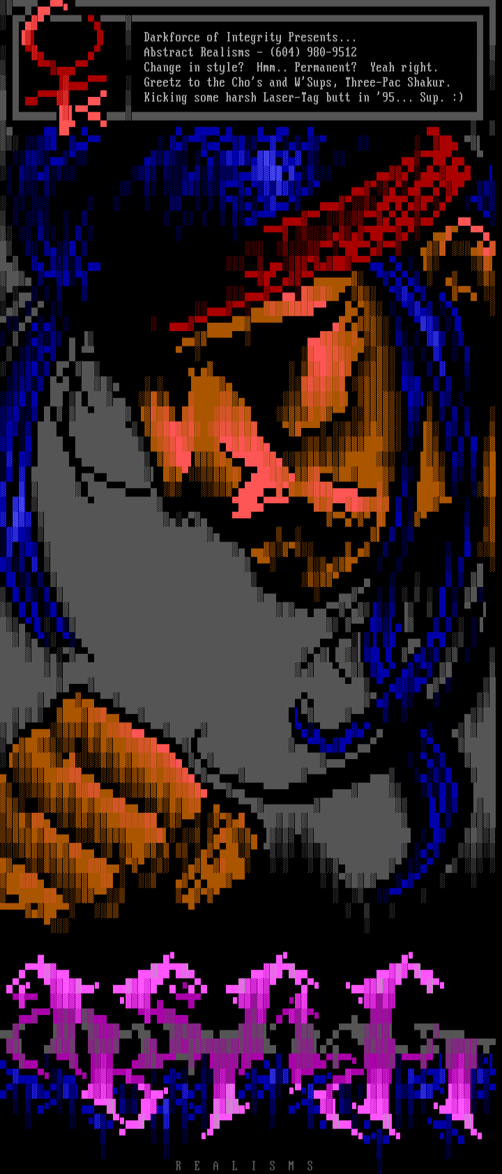 Darkforce of Integrity Presents... Abstract Realisms - 604 980-9512 Change in style? Hmm.. Permanent? Yeah right. Greetz to the Chos and WSups, Three-Pac Shakur. Kicking some harsh Laser-Tag butt in 95... Sup. :