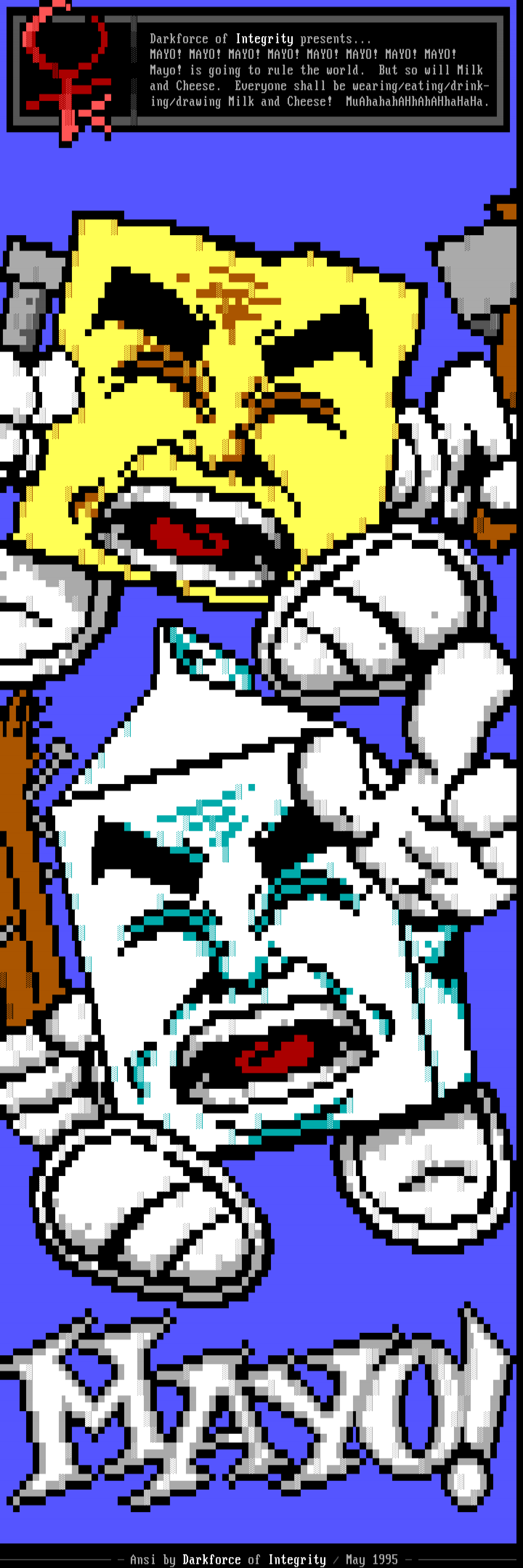 Darkforce of Integrity presents... MAYO! MAYO! MAYO! MAYO! MAYO! MAYO! MAYO! MAYO! Mayo! is going to rule the world. But so will Milk and Cheese. Everyone shall be wearing/eating/drink- ing/drawing Milk and Cheese! MuAhahahAHhAhAHhaHaHa.
