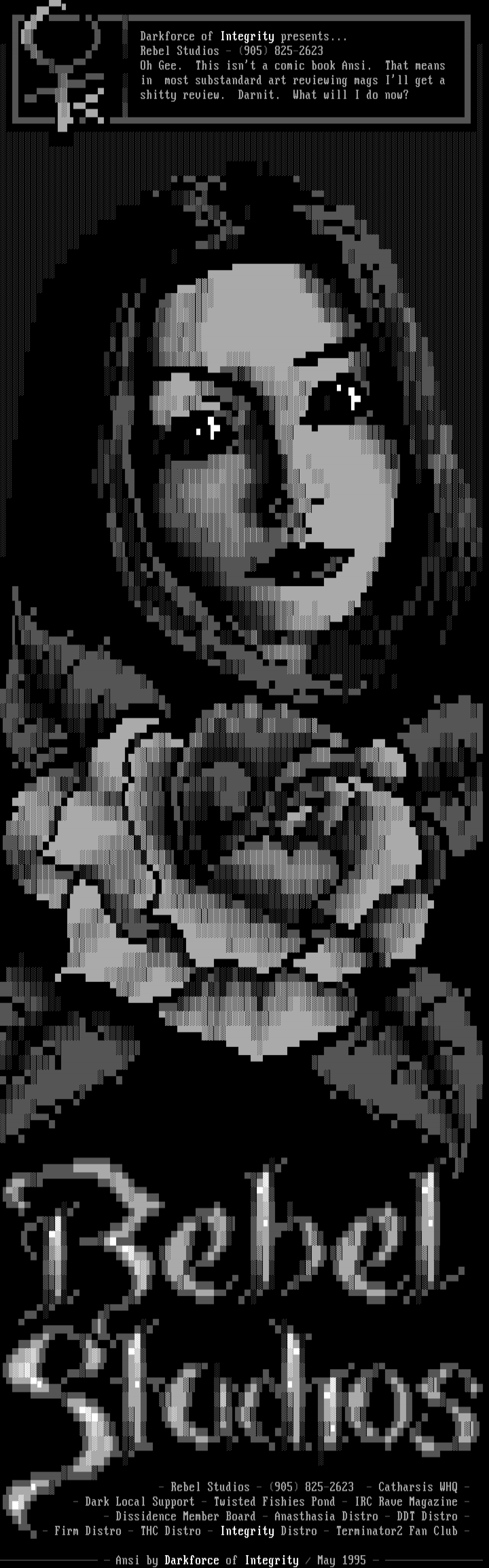 Darkforce of Integrity presents... Rebel Studios - 905 825-2623 Oh Gee. This isnt a comic book Ansi. That means in most substandard art reviewing mags Ill get a shitty review. Darnit. What will I do now?