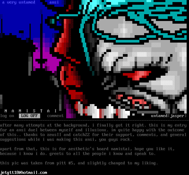 a very untamed ansi jasper rules and so does namistai bbs fuck you to anyone who thinks comic rips are shit..you try do one N A M I S T A I log on LOG OFF comment untamedjasper