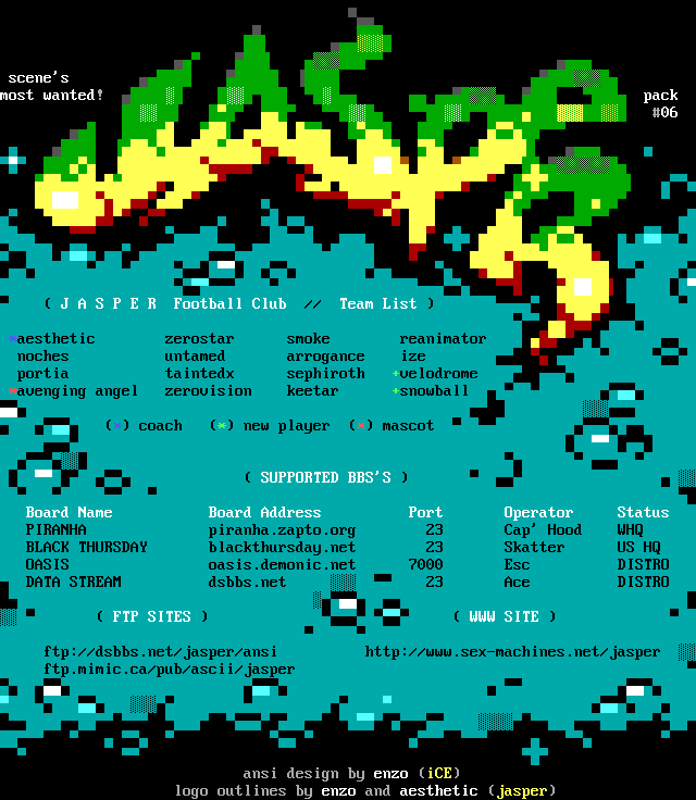 J A S P E R Football Club // Team List *aesthetic zerostarsmoke reanimator noches untamed arrogance ize portia taintedx sephiroth+velodrome *avenging angelzerovision keetar +snowball * coach*new player* mascot SUPPORTED BBSS Board NameBoard AddressPortOperatorStatusPIRANHA piranha.zapto.org 23Cap Hood WHQBLACK THURSDAYblackthursday.net23SkatterUSHQOASISoasis.demonic.net7000EscDISTRODATA STREAMdsbbs.net23AceDISTRO FTP SITES WWW SITE ftp://dsbbs.net/jasper/ansihttp://www.sex-machines.net/jasperftp.mimic.ca/pub/ascii/jasper