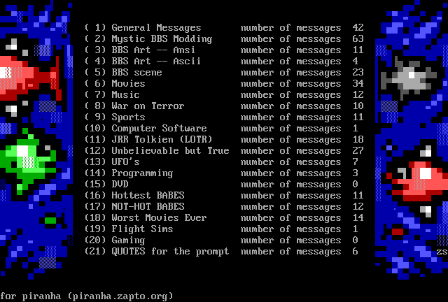 2 Mystic BBS Modding number of messages 63 3 BBS Art -- Ansi number of messages 11 4 BBS Art -- Ascii number of messages 4 5 BBS scene number of messages 23 6 Movies number of messages 34 7 Music number of messages 12 8 War on Terror number of messages 10