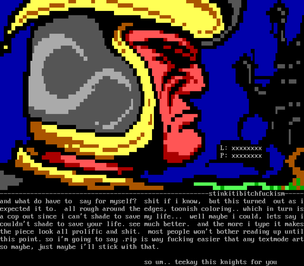 -------------------------------------------------------stinkitibitchfuckism-----and what do have to say for myself? shit if i know, but this turned out as iexpected it to. all rough around the edges, toonish coloring.. which in turn isa cop out since i cant shade to save my life... well maybe i could, lets say icouldnt shade to save your life. see much better. and the more i type it makesthe piece look all prolific and shit. most people wont bother reading up untilthis point. so im going to say .rip is way fucking easier that any textmode artso maybe, just maybe ill stick with that.
