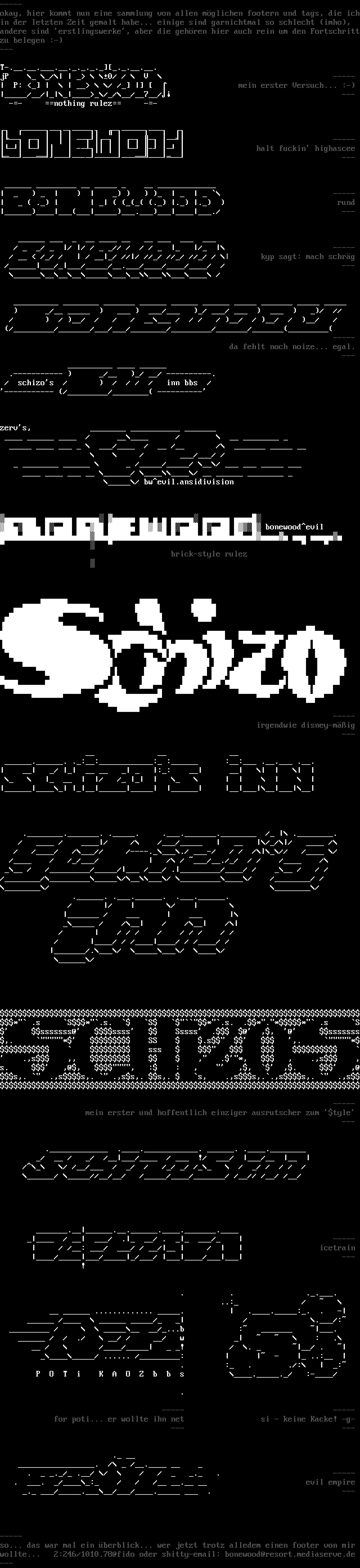 so... das war mal ein berblick... wer jetzt trotz alledem einen footer von mir wollte... 2:246/1010.78@fido oder shitty-email: bonewood@resort.mediaserve.de