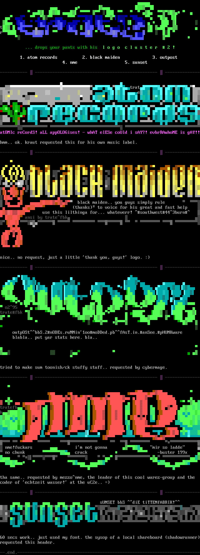 p ... drops your pants with his l o g o c l u s t e r 2 ! bH LU 1. atom records 2. black maiden 3. outpost OC 4. nme 5. sunset OK D----------- ------------------------------------------------- --------------