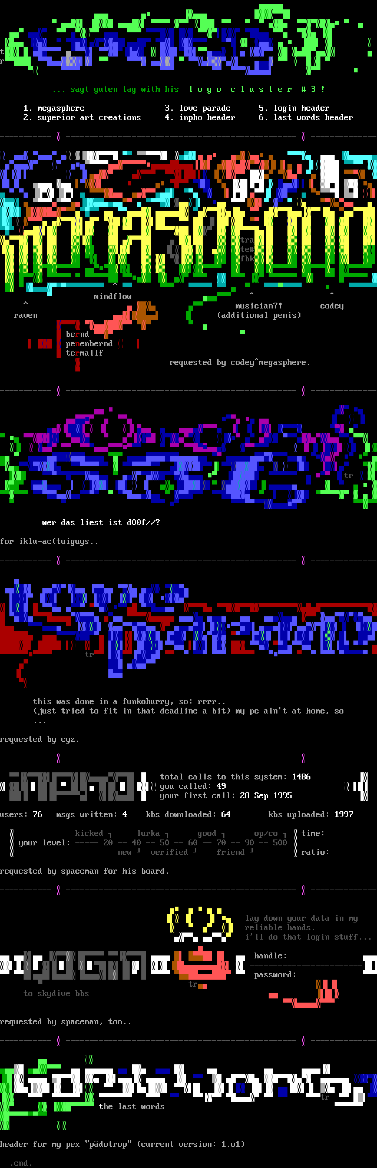 p ... sagt guten tag with his l o g o c l u s t e r 3 ! bH LU 1. megasphere 3. love parade 5. login header OC 2. superior art creations 4. inpho header 6. last words header OK D----------- ------------------------------------------------- --------------