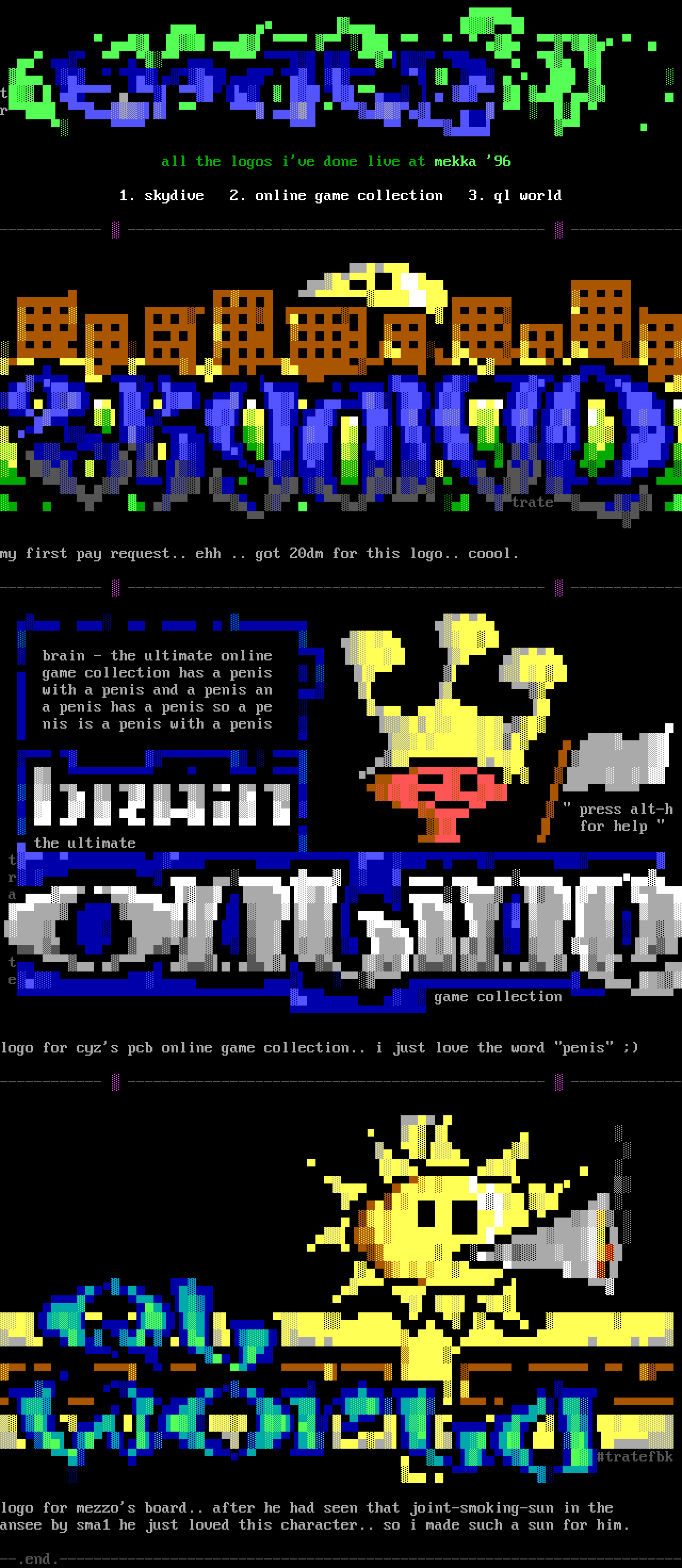 p bH all the logos ive done live at mekka 96 LU OC 1. skydive 2. online game collection 3. ql world OK D------------ ------------------------------------------------- -------------