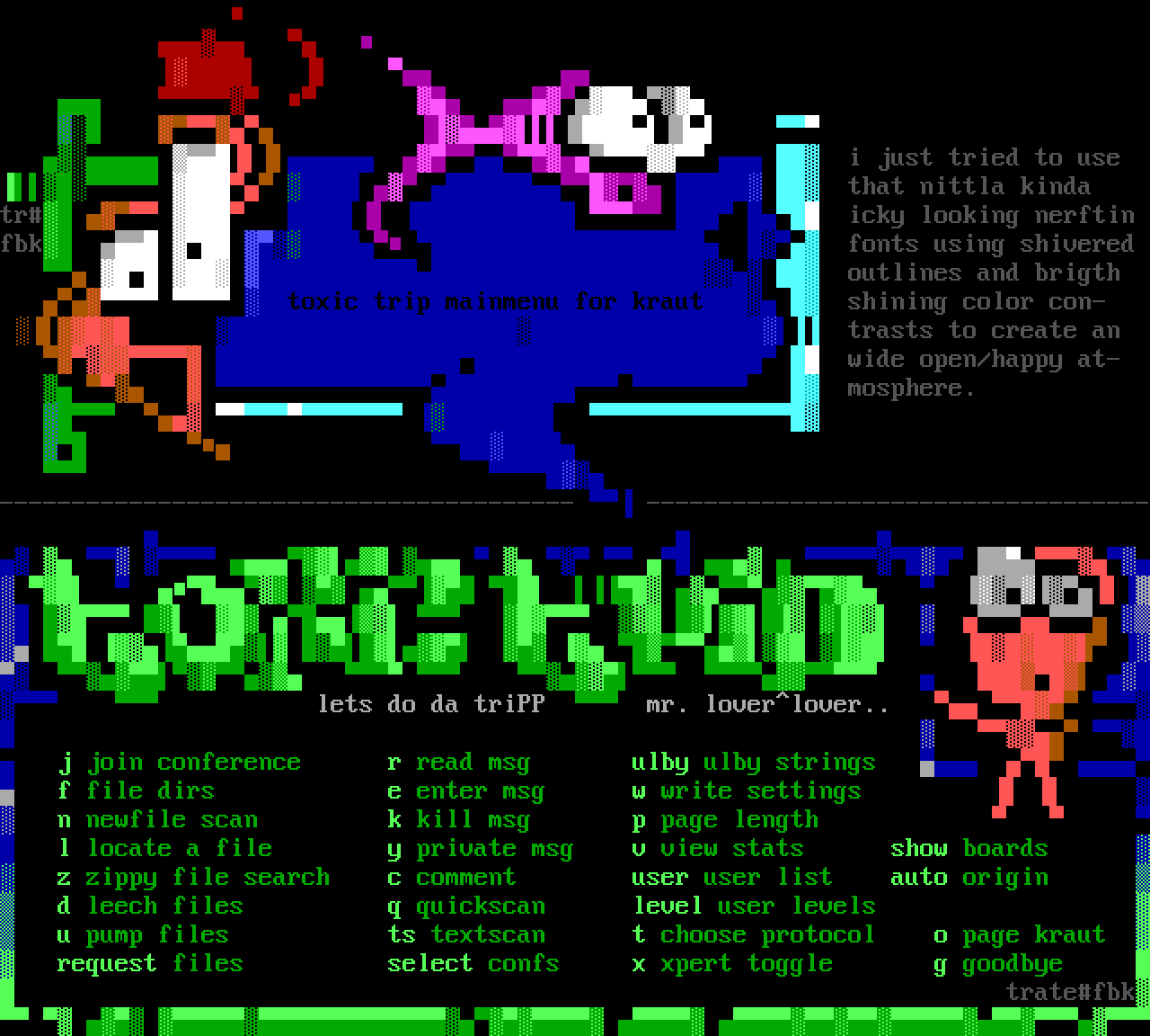 lets do da triPP mr. loverlover.. j join conference r read msg ulby ulby strings f file dirs e enter msg w write settings pHUCK bLOOD n newfile scan k kill msg p page length l locate a file y private msg v view stats show boards