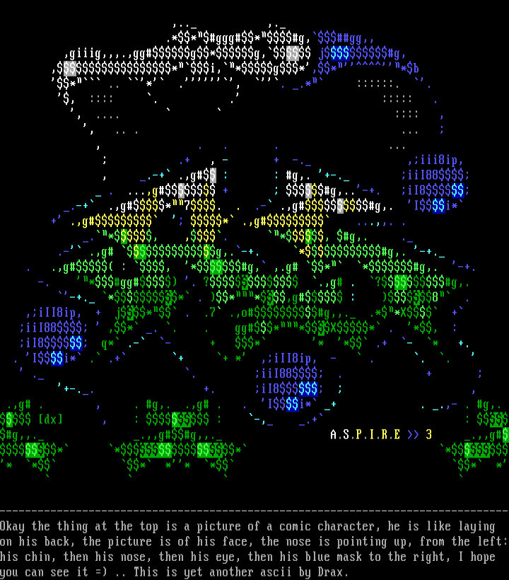 --------------------------------------------------------------------------------Okay the thing at the top is a picture of a comic character, he is like laying