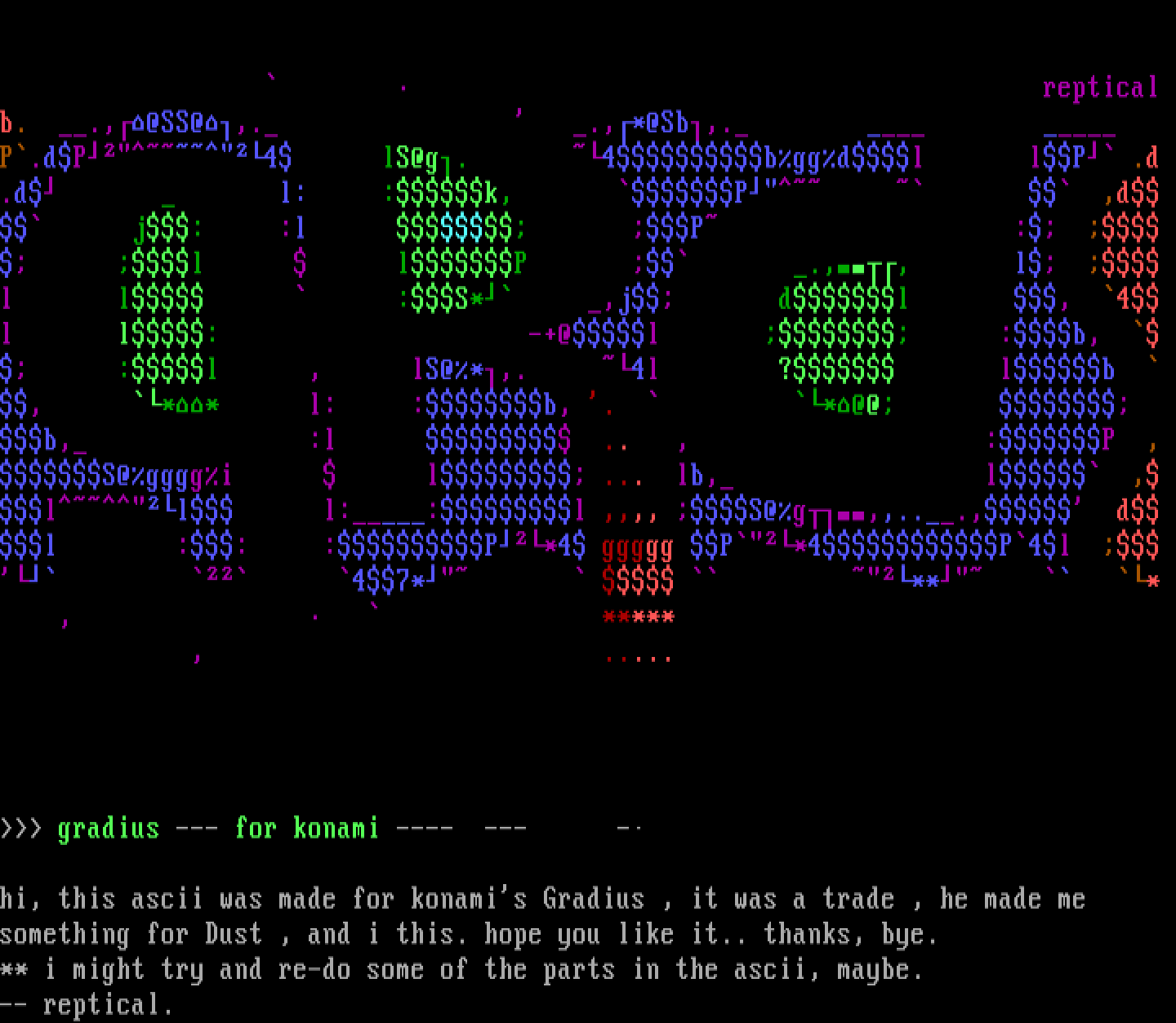 hi, this ascii was made for konamis Gradius , it was a trade , he made me something for Dust , and i this. hope you like it.. thanks, bye.