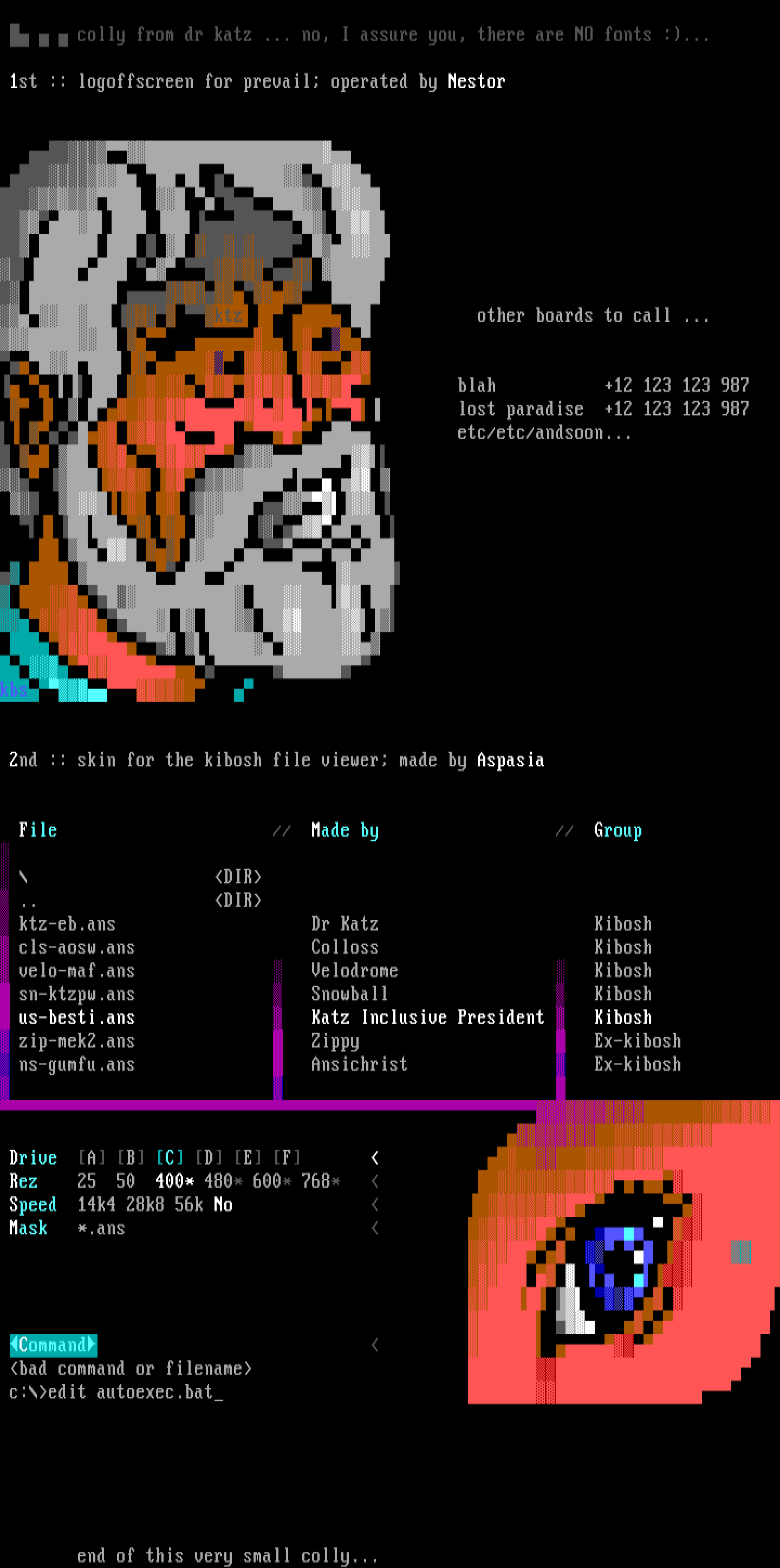 Katz!! Drive A B C D E F Rez 25 50 400* 480* 600* 768* Speed 14k4 28k8 56k No Mask *.ans Command