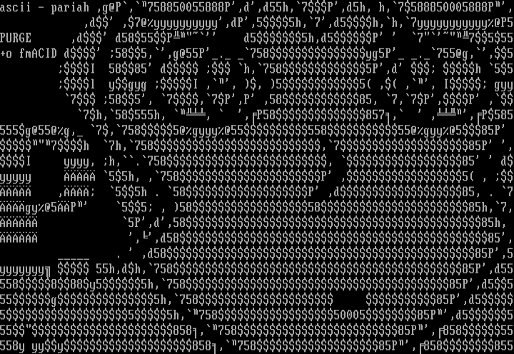 ascii - pariah ,g@P,758850055888P,d,d55h,7P,d5h, h,7588850005888P, ,d ,7@yyyyyyyyyy,dP,55h,7,d5h,h,7yyyyyyyyyyy@P5PURGE ,d d5855P d55h,d5P 77555+o fmACID d 585,,g@55P. 758yg5P .755@g,,5 I 5885 d h,7585P,d h 55 l ygyg I ,, , 55 , ,, I gyy 7 585, 7,7P,P ,5885, 7,7P,P , 7h,58555h, , ,P58857, ,,P585555g@55@g, 7,7585@gyyy@5555855@gyy@585P