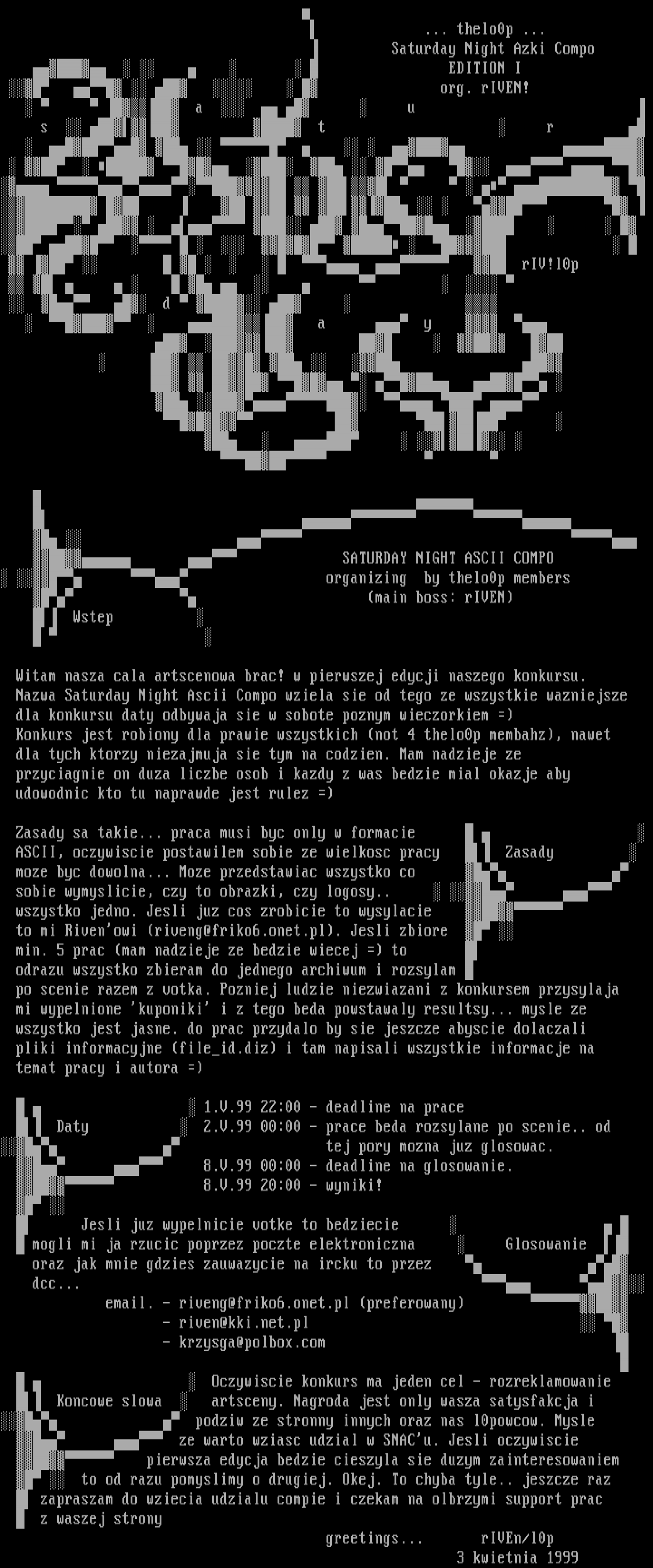 Nazwa Saturday Night Ascii Compo wziela sie od tego ze wszystkie wazniejsze
