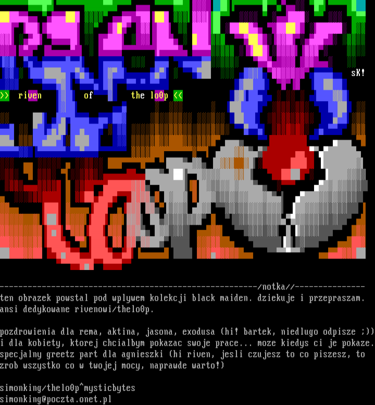 pozdrowienia dla rema, aktina, jasona, exodusa hi! bartek, niedlugo odpisze i dla kobiety, ktorej chcialbym pokazac swoje prace... moze kiedys ci je pokaze.specjalny greetz part dla agnieszki hi riven, jesli czujesz to co piszesz, to